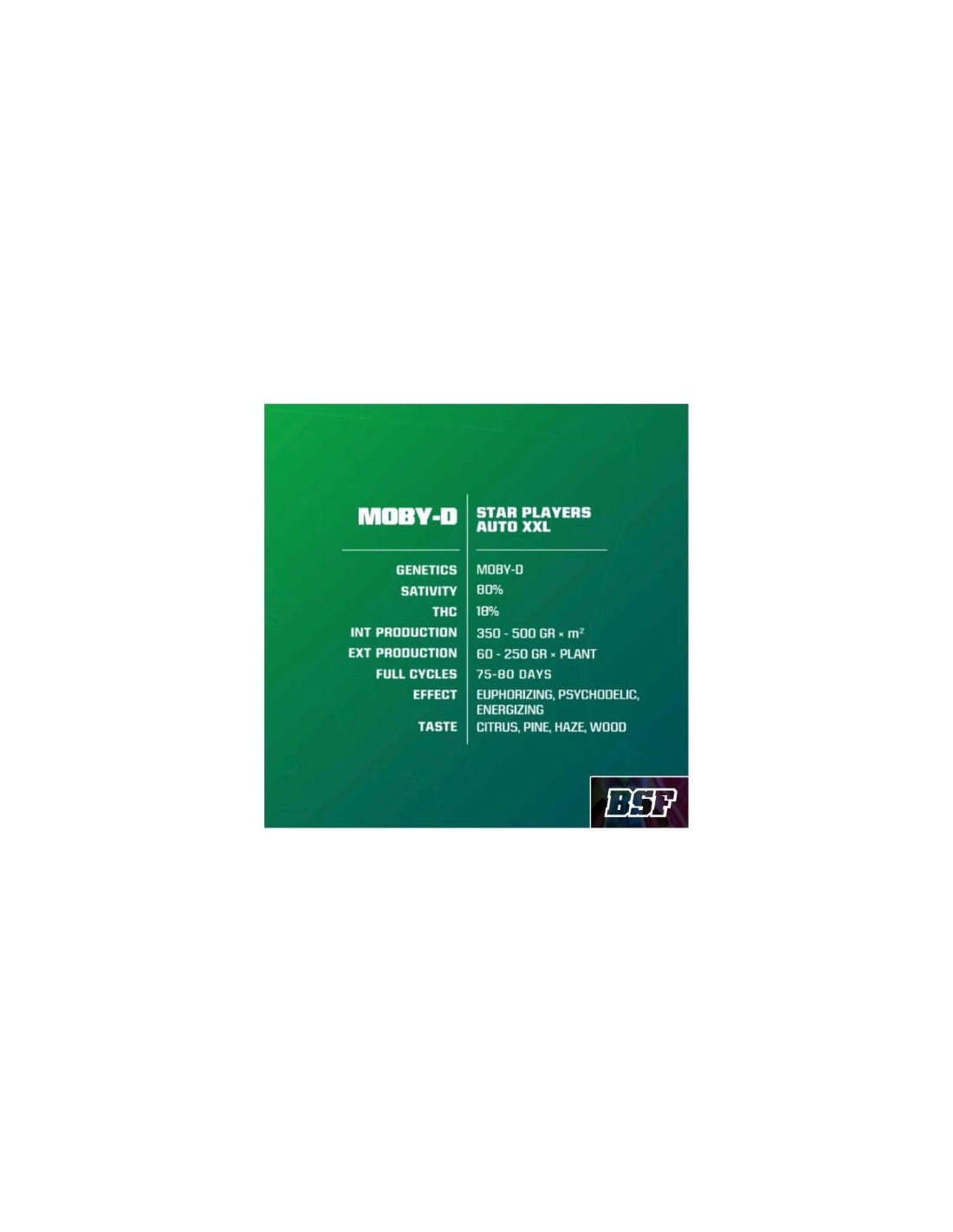 Questa varietà conserva tutte le caratteristiche di Moby-D femminizzata che l’hanno fatta diventare così popolare, ma con la velocità di un’autofiorente. Per ottenere risultati in indoor si deve cercare di mantenere uno spazio sufficiente per lo sviluppo, per cui ti suggeriamo di non mettere insieme un gran numero di piante oppure rimarrai subito senza spazio sufficiente. In outdoor suggeriamo trapiantarle in un vaso di capacità minima di 11 litri perché possa liberare tutto il suo potenziale.